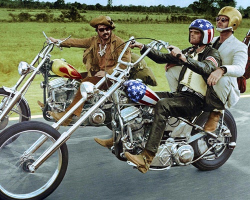 Bez zhlédnutí, nejlépe několikerého, kultovní road movie na Harley-Davidson ani nelez. Dvojice hippies Peter Fonda a Denis Hopper vydělá slušný peníz na drogách, sedne na mašiny a vyrazí z Los Angeles do New Orleansu na karneval. Famózní záležitost, ve které poukázal poprvé na svůj talent Jack Nicholson, za roli právníka si vysloužil nominaci na Oscara. Ačkoli byly v rámci natáčení použity čtyři harleye, největší pozornosti se těšil na zakázku postavený chopper Petera Fondy s ikonickou nádrží. Za vzor posloužila mašina Harley-Davidson Hydra-Glide z roku 1952, kterou pořídil Peter Fonda na policejní aukci. Bohužel, ani jedna z motorek se neuchovala, jedna byla zničena v poslední scéně, další tři zmizely neznámo kam.