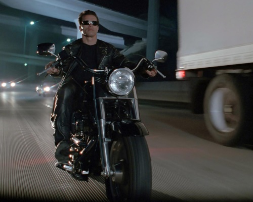 Arnold Schwarzenegger a správná mašina ve snímku, ve kterém jde o budoucnost lidstva. V prvním díle sice likvidace Sarah Connor, matky budoucího vůdce lidstva, ve válce proti strojům nevyšla, nový Terminátor, typ T-1000, se však vrací po deseti letech zpět do Los Angeles, terčem je tentokrát syn John Connor. Scenáristé se s motorkou a jezdcem příliš nemazlili, neboť v jedné ze scén vyslali něco málo přes 300 kg těžký stroj na skok do třímetrové hloubky kanalizace v Los Angeles. Díky Arnoldovi se Harley-Fat Boy těší z postavení jedné z nejprodávanějších motorek značky.